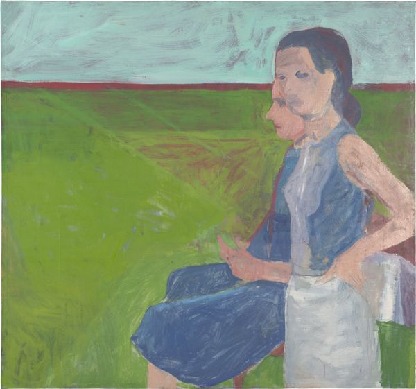 Curator: Here we have Louisa Matthiasdottir’s painting, "PORTRAIT", rendered in oil on canvas. It's a captivating, almost assertive figure study. What are your first thoughts? Editor: The most striking aspect is the bold colour palette, isn't it? Juxtaposed against the neutral backdrop, the bright stripes on the subject’s sweater and the slightly bizarre hat, well, they certainly command attention. The artist isn’t afraid to flatten the space. Curator: Indeed. Matthiasdottir creates a vibrant representation, using the colours as symbolic markers of her sitter’s personality. The red hat speaks to a fiery spirit, and the mix of blues and greens may reflect both stability and growth, perhaps an active, fertile mind. The simplified forms encourage us to look beyond the surface appearance. Editor: That's quite plausible. But what intrigues me is the texture—or rather, the relative lack thereof. There are such distinct, delineated planes of colour. Notice the brushstrokes are direct and purposeful, not blended or softened as we might expect in traditional portraiture. This intensifies the emotional impact by emphasising the construction of the image itself, pushing us to ask what representation even means here. Curator: Consider her Icelandic background, a landscape shaped by strong light and shadow, which could well translate here into distinct planes and blocks of colour. Beyond technique, she communicates resilience. Notice the subject’s pose – hand confidently on hip, direct gaze… she embodies strength. The colours become a kind of shield. Editor: It also evokes certain stylistic trends from Pop Art. Look how Matthiasdottir utilizes flat planes and intense colour to remove nuance. The woman’s individuality isn’t about interiority. It’s about the image presented: vivid, uncomplicated, immediately readable, even humorous. The effect isn't just psychological; it also makes the sitter appear approachable. Curator: That reading emphasizes a fascinating paradox: that Matthiasdottir both simplifies and amplifies the subject through her colour choices, crafting an emblem of stoicism tinged with humor. It's a statement of presence, resisting sentimentality in favour of an immediate connection. Editor: I concur. We start with an intriguing assembly of shapes and colours, and gradually perceive an echo of boldness of character through visual structure and representation.