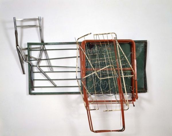 Here we see Rauschenberg playing with wire, Perspex and found objects to create ‘Dry Cell.’ The linear framework, like a 3D drawing in space, almost eclipses the objects contained within it. The materials Rauschenberg uses seem to be whispering of their former lives: the utilitarian battery, the printed circuit board, the blurred image of a helicopter. Everything is muted, veiled by the translucency of the Perspex and by the patina of time. The shadow cast on the wall behind is as much a part of the piece as the materials from which it is constructed. I love the way that the shadow extends the linear logic of the form, transforming this small, intricate sculpture into something monumental. Rauschenberg was a master of juxtaposition, bringing together disparate objects and images to create new meanings. Think of Kurt Schwitters, with his collages made from found ephemera, or even Duchamp, and his readymades. Art is just the echo of other art.