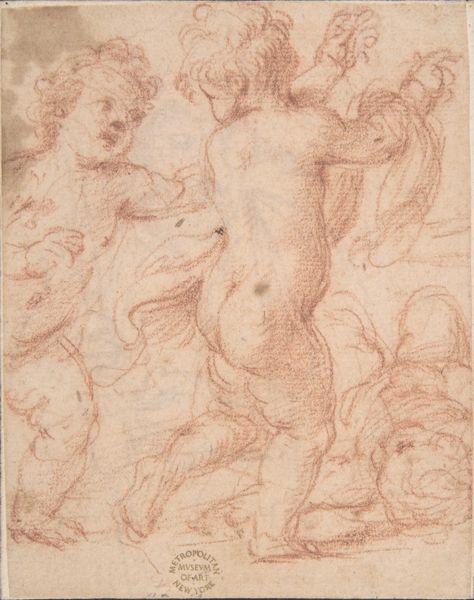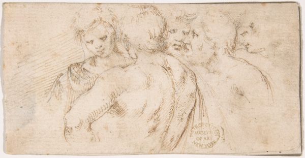 Curator: What an incredible work to contemplate. This drawing offers us the left-hand portion of a border, originally below Domenico Beccafumi's "Sacrifice of Isaac" for the inlaid-marble pavement in the Siena Cathedral. It dates from around 1520 to 1550. Editor: Okay, immediate impression? A gathering of titans! Look at the drama, the intense musculature. But they're oddly passive for all that. Troubled, almost. What's the mood? Curator: The emotional restraint certainly contributes to its power. Given its placement in the Cathedral, this section would have been one of several in a larger series illustrating Old Testament stories—visual anchors to core Christian narratives. Do you pick up on the allusions? Editor: Definitely a feeling of ancient stories re-told. A lot of biblical weight pressing down, even in what must have been the border. Are those just men or representations of gods, too? Mythic almost… I wonder what went through Beccafumi's head to get these people in there! What do their gestures MEAN? Curator: Yes, mythic is key. The piece serves a double role: architectural and didactic. It frames and enriches the “Sacrifice of Isaac” scene above, while simultaneously alluding to other aspects of faith, power and history in Florence. The figures here represent aspects of authority – secular as much as ecclesiastical. Look at their clothes as much as their physique. Editor: Ah, now that you mention their garb... I was getting too caught up in the muscles and forgot about their clothes. I guess everyone at the church, even the gods are trying to flex a bit. I was wondering how it functioned at all, visually, within the greater composition... Now the borders makes a ton more sense to my mind, knowing there's all these added layers of symbolic context built into those stone pieces. Thanks for illuminating them. Curator: Beccafumi was clearly working to elevate the whole symbolic vocabulary. The image itself resonates over time – its history literally embedded in every figure, and even on their robes, from which ideas and meanings flow. So it continues to invite further reflection across cultures and eras. Editor: Right. You know, thinking about how people react differently depending on where they're coming from is very much true here. Maybe one person will get it right away – or someone just looking at the drawing now? Who knows. Curator: It's true, that very possibility underscores why this inlaid border remains so alive to us, even today. A true gift, that keeps on giving… Editor: Exactly. These silent marble characters whisper all those histories – you just need to listen… or, you know, come with a friend that's got a nice iconographical eye for these symbolic gems, right?