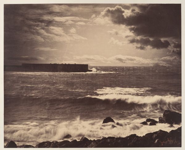 Curator: We’re looking at Gustave Le Gray’s “Mer Méditerranée - Sète,” taken in 1857. It's a gelatin silver print, a seemingly simple image of the sea... but so much more. Editor: My first thought? Drama. It feels like I'm witnessing a tempestuous love affair between light and water. The mood is both romantic and a little…foreboding. Curator: Absolutely. The contrast is what makes it, I think. The silvery water against that incredibly expressive sky, full of swirling clouds, almost feels operatic. In terms of symbols, you might consider water, across different cultures, is associated with emotion and sky representing changeability. Editor: I'm interested that Le Gray would attempt capturing something so… vast, so essentially fleeting. What about the technical challenges in this era? The collodion process hadn’t yet developed to where this photo could exist as it is now! Curator: Le Gray was a pioneer, a true artist-scientist. He famously combined two separate negatives – one for the sea and one for the sky – to overcome the limitations of photographic technology at the time. Exposing for the sea resulted in overexposed skies, so this compositing allowed him to retain details in both. It’s both realism and romanticism intermixed here! Editor: Knowing that those were two separate negatives... it actually adds another layer for me. Because you know that specific union of sky and sea never existed in the real world; the photographer imagined their pairing. Curator: And perhaps he understood their archetypical, symbolic power, not only as the site of myth but the potential for sublime emotions. In that era, photography had such limited capacity, people used it not to document so much as evoke feeling. And what is that land doing in the corner, barely hanging on in frame? Editor: That is something else too! Is it the present trying to desperately find an attachment to the infinite of what came before? So, as we stand here contemplating it, what remains with you? Curator: The sheer artistry. Le Gray manipulated reality to express something deeper. It reminds us that even in so-called objective mediums like photography, there's always room for a subjective vision. Editor: For me, it’s the sheer audacity. Combining separate images, bending reality. The pursuit of that elusive, almost impossible balance—that’s the magic of the piece. Thanks for this, it was fantastic!