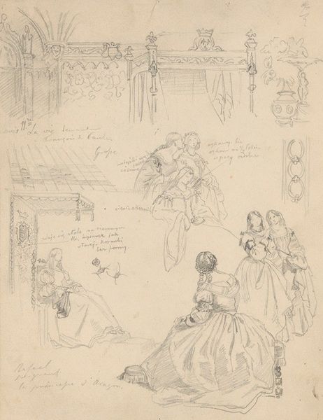 Curator: Thomas Stothard's "Nuns before an Altar," currently in the Tate Collections, presents a sketch-like view of religious life. Editor: It’s the raw quality of the sketch that grabs me—the immediacy of the ink on paper, the swift capturing of gestures. Curator: Stothard, active in the late 18th and early 19th centuries, often focused on scenes of everyday life, though usually more polished than this. The sketch may have been a study for a larger, commissioned piece. Editor: The material reality of monastic life is quite literally laid bare here—the austerity, the ritual. The quick strokes denote simple garments, repeated gestures. It speaks volumes about repetitive labor. Curator: Indeed, and the composition also reflects the church's role in structuring society, dictating roles and rituals. How do you feel about the depiction? Editor: There’s a certain detachment, a sense of observing rather than participating, which I find very telling about class and production. Curator: It's a glimpse into a world shaped by faith and societal expectations. Editor: Precisely—a reminder of the labor behind devotion, visible in the material.