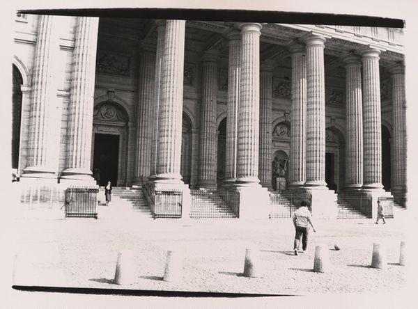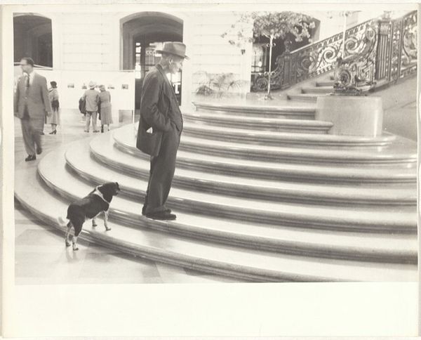"Public Ceremony - Casper, Wyoming" is a black and white photograph by Robert Frank. It captures a moment, not made up of sweeping gestures, but subtle details. The tones range from deep blacks to soft grays, achieving a striking contrast that really adds to the drama. There's a kid in a striped shirt, perched on a ledge like he’s not really part of the event, and chairs sitting empty on the steps. They are waiting for the event to begin, or they are leftover, waiting to be cleared away after it is done. The emptiness of the chairs contrasts with the art deco embellishment of the building behind the kid. This is offset by the texture of the stone steps and a smear of light that crosses the shot. This smear is a mistake, it’s part of the making, but Frank doesn’t try to hide it. It becomes a ghostly element that obscures and distorts the scene, reminding us that this is a picture, a fragment, a thing. Frank's work shares some similarities with that of Walker Evans, especially in its documentary style. But Frank’s images often feel more personal, more raw. His photography embraces imperfection, hinting that life is full of uncertainties.