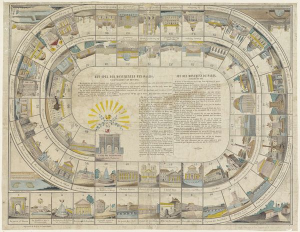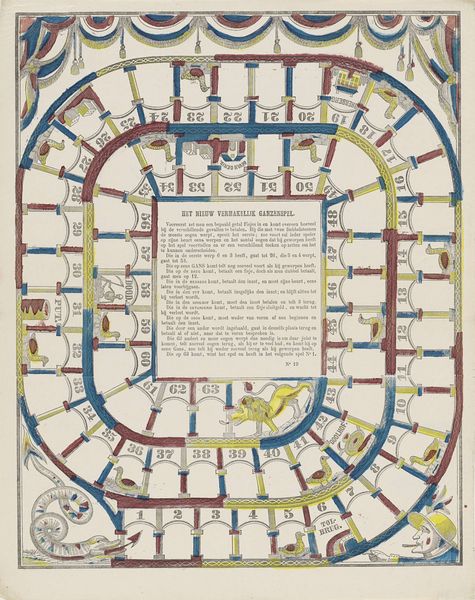 Lutkie & Cranenburg created this game board, Het vermakelijk ganzenspel, printed on paper, its date unknown. At first glance, the game board's structure is visually striking: a spiraling, almost dizzying, path defined by numbered segments within a square format. The use of color is restrained, mostly muted yellows, blues and reds, which adds to the game's antique feel. These aren't merely decorative; they organize the space, indicating different zones with symbolic meanings. The numbers create a clear sequence, yet the images of geese and obstacles along the path suggest a journey fraught with chance and possible setbacks. Consider how the game challenges the idea of linear progression. The spiral design disrupts the conventional start-to-finish line, suggesting life's unpredictable nature. It's a structured system, but also an open field of possibilities, where progress can be altered by external factors. The circular composition, combined with the detailed illustrations, transforms a simple game into a contemplation on human experience.