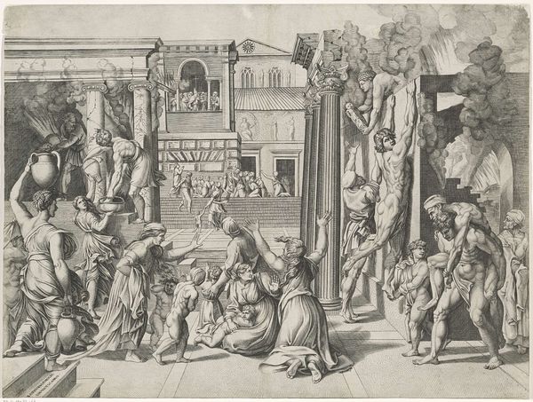 Editor: This is Dirck Volckertsz Coornhert's "Expulsion of Heliodorus from the Temple," made in 1549. It’s an engraving, so quite detailed and intricate, even if it's not huge. I'm struck by the dramatic contrast. The chaos on the right versus the almost serene praying figure in the center makes for a very unsettling mood. What do you make of the symbolism here? Curator: This work visually captures the story from the Old Testament’s Second Book of Maccabees. The image, though, transcends mere illustration. The symbols are not just descriptive but deeply resonant with cultural memory. We see the temple, representing a sacred space, defiled by Heliodorus's greed, juxtaposed with the divinely-sent horsemen driving him out. Notice the posture of the praying priest versus the writhing body of Heliodorus. Where do you think the true power lies in this composition? Editor: I see what you mean! It is a pretty clear "good versus evil" set-up. But what’s fascinating is the almost manic energy Coornhert uses to portray evil and weakness. It's almost like it revels in it. Curator: Exactly. The artist is working in the Mannerist style. Think about that exaggeration of form and perspective, of emotion – they amplify the drama and draw the viewer into the emotional turmoil. It's a spectacle, and that spectacle reinforces the sacred power being defended. This isn’t just about a historical event; it’s about reaffirming faith. Can you feel how images like this would’ve been very persuasive? Editor: Definitely, I can see that! Looking closely, it is so much more than just a depiction. It's really designed to impact the viewer. Curator: Precisely. And it’s those layered symbols, constantly reiterated over centuries, that cement cultural and religious narratives into the collective psyche. The past becomes permanently intertwined with the present through the emotional punch of these images.