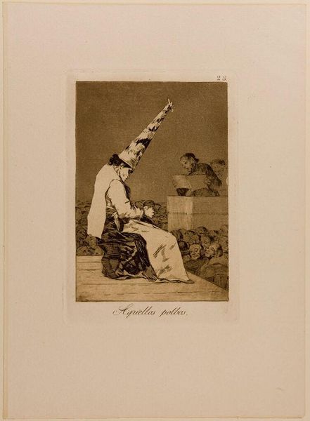 Curator: Goya's print, "Those Specks of Dust," presents a haunting scene. I am immediately struck by the unsettling, almost nightmarish quality of the image. Editor: The texture created through etching and aquatint gives it a physical weight. The clothing, the pointed hat—are those symbols of power, or subjugation? How does it affect the viewer's perspective? Curator: Absolutely! The tools employed and how Goya wielded them is everything. The contrast between light and shadow really emphasizes the materiality of the print itself, as well as the social commentary. Editor: You're right—it feels like looking into a collective anxiety. The dust could represent all the things that bury us, physically, spiritually. Curator: And that anxiety becomes a tangible thing through the means of production, doesn't it? Editor: It certainly does. Makes me wonder, what "dust" are we creating now?
