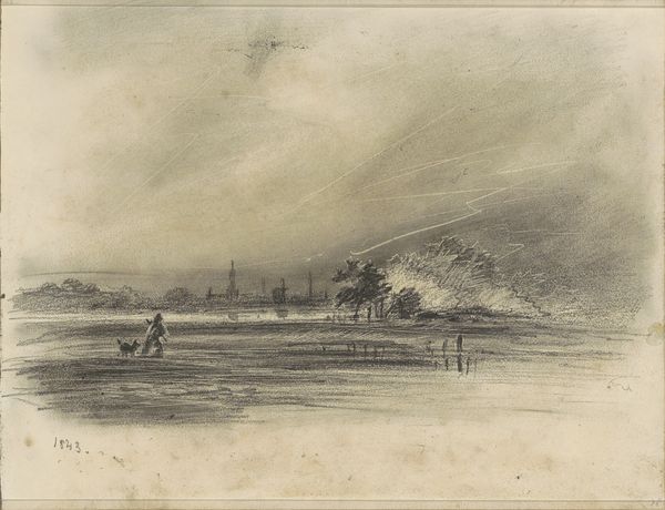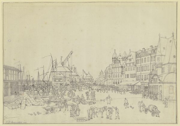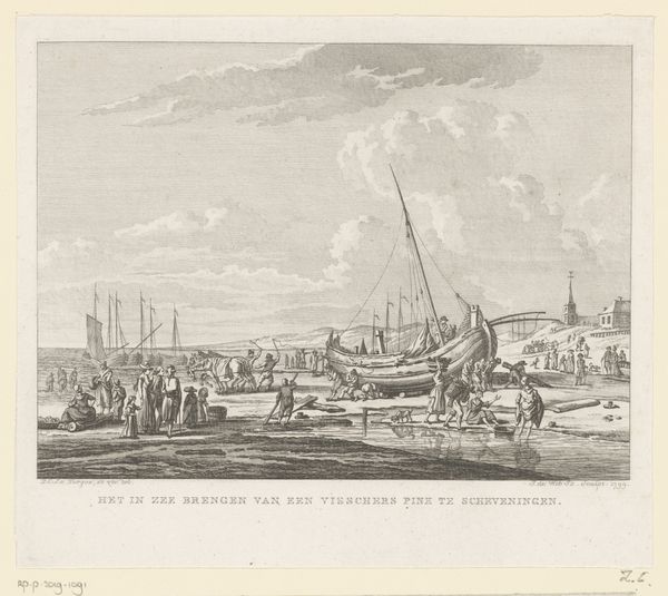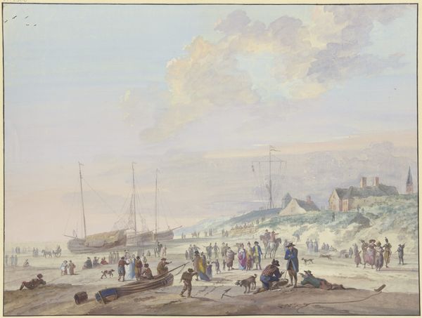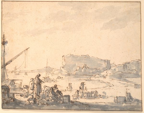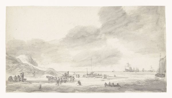 Simon de Vlieger sketched "Fishermen Drying Nets on Scheveningen Beach" using graphite on paper, capturing a serene coastal scene. Dominating the foreground, fishermen attend to their nets, symbols of labor and sustenance intertwined with the sea. The nets themselves, spread out to dry, echo motifs found in ancient fishing communities, where nets symbolized both provision and peril. Consider the cyclical nature of these activities—drawing parallels to the endless cycle of human needs and the enduring relationship between humanity and the sea. The fishermen engaged in their work, heads bowed, evoke a sense of timeless toil and the inevitable return to the sea. This scene, both specific to its time and universal in its depiction of human struggle and perseverance, reminds us of the cyclical patterns embedded within the human experience. We see here a powerful visual statement on the eternal dance between humanity and nature, resonating on a deeply subconscious level.