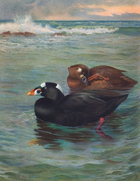 Editor: This is Archibald Thorburn’s "Scaup Duck," painted in 1913. It’s mostly watercolour, I believe. It gives me such a peaceful feeling, but I'm also struck by the realism—almost photographic in its detail. What stands out to you when you look at this painting? Curator: The interplay between form and detail here is fascinating. Notice how Thorburn uses distinct brushstrokes to define the individual feathers, creating texture, while the overall composition employs softer, more diffused washes to represent the water and sky. It's this tension, or perhaps complement, between precision and atmosphere that arrests the viewer's eye. Editor: So it's a push and pull that creates the impact? The realistic depiction versus the sort of diffused background? Curator: Precisely. Observe the gradations of colour within the plumage of each duck; they’re not merely painted in a single hue, but rather through layers of pigment to suggest depth and dimension. Ask yourself: How does Thorburn make the texture of feathers so tangible and the movement of the water so fluid? It is, in a sense, painting the *idea* of texture and movement more so than strictly replicating reality. Editor: That’s really interesting! The "idea" of the feather or movement. The way the colours blend into each other... It's like he's built up the image with lots of transparent layers of colour! Curator: Indeed. The light is diffused so effectively to give this dream-like feel that you remarked upon initially, however, on closer inspection it is an accumulation of layers of meticulous artistic decision. He captures not just the visual aspect, but also the very essence of this bird. Editor: I definitely see the depth now in this "Scaup Duck." I came expecting a tranquil natural scene, and you’ve shown me a complex formal construction! Thank you. Curator: My pleasure. The synthesis of form and observation—a lesson we can take away from all great art, surely?