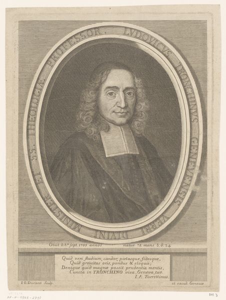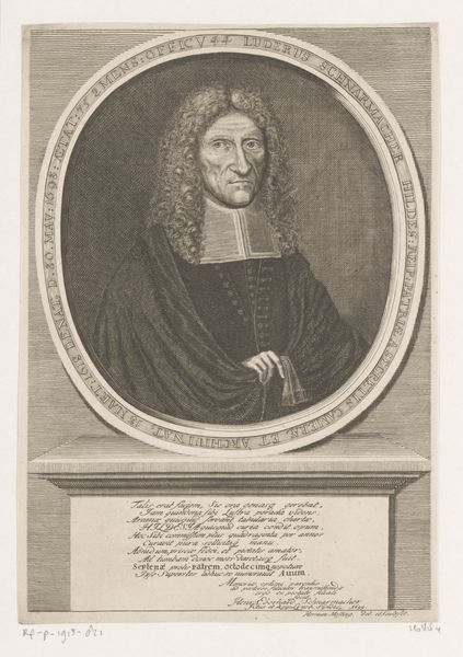 Curator: Here we have an engraved portrait of Johann Schmiedt at the age of 66, dating from the late 17th century, now residing at the Rijksmuseum. Editor: My first impression? The overwhelming mass of his hair immediately catches the eye! It creates this rather dramatic halo around his face. Curator: Yes, the engraver really emphasizes the texture, the dark versus light creating a play between soft curls and severe linearity within the oval frame itself, a tension that is quite baroque. What could be said about the subject himself? Editor: Schmiedt was, according to the inscription, "Proto-Physicus Gedanensis", or First Physician of Gdansk. We’re looking at not just a portrait but a statement of civic importance, something that links individual achievement to urban pride in a prosperous, cosmopolitan city, Gdańsk. The artistic conventions signal status, intellect, success. Curator: Indeed. The engraving exemplifies the era's sophisticated graphic techniques. Note how the fine lines create variations of light and shadow. See the subtle hatching suggesting depth. Editor: Precisely! And if we situate the piece within its original context—prints like these often circulated among the learned classes, almost like collectible cards affirming their network of associations, then perhaps what matters most are not merely aesthetics, but also meaning and impact. This engraving announces the prestige, legacy and contributions of Herr Schmiedt! Curator: I would just note further how elegantly those elements are organized by the engraver: see how they framed that subject, his name centered, immortalizing his likeness through visual order and design. I believe, the laurel branches add classic motifs to emphasize these important ideals, framing him inside. Editor: Agreed. Looking at the details beyond just technical elements of engraving, it suggests also the rise of this individual and thus wider middle-class influence on visual culture! It shows how the political and socioeconomic changes of the late 17th century reflect through this engraved picture, turning art into historical witness! Curator: Looking deeper at the material's subtle textures, we started today discussing pure visuals of art itself. Editor: But by considering the engraving within a broad context, we better understand how art acts within societies and across generations!