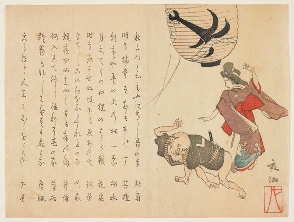 Yokoyama Kazan created this print, "Children at Ohitaki Festival," using woodblock and ink in the Edo period. The print portrays children participating in a fire festival, a vibrant expression of community and spiritual life. Consider the festival itself, a moment where social class distinctions blur. The children, regardless of their backgrounds, unite in this shared cultural experience. Kazan captures their joy and excitement, inviting us to reflect on the inclusive nature of such events. During the Edo period, festivals were crucial for social cohesion, offering a break from the strict hierarchies of the time. There is an emotional intensity captured in the children's faces and gestures. Kazan preserves a vision of childhood bound to community identity, while offering a perspective on cultural practices that continue to resonate.