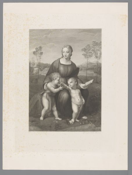 Editor: We’re looking at a print titled “Maria met Christus en Johannes de Doper” by Jean Nicolas Laugier, dating from the mid-19th century. It features Mary, Christ, and John the Baptist in a garden setting. I’m immediately struck by its serene and idealized depiction, the halos adding to the figures' sense of divinity. What symbols stand out to you in this image? Curator: The most prominent symbol is undoubtedly the garden itself. "La Belle Jardiniere", as it's titled, roots the divine figures in a natural, almost earthly, space. Think about what a garden represents: growth, nurturing, but also Eden, loss, and redemption in Christian theology. Notice how the artist carefully renders the landscape in the background, subtly hinting at a world beyond this enclosed, sacred space. It seems Laugier wants us to reflect on how the holy inhabits our world. What feelings do these elements evoke for you? Editor: I feel a sense of peacefulness, maybe even nostalgia? It reminds me of Renaissance paintings with a similar theme. Curator: Precisely. This engraving evokes a kind of cultural memory through its Neoclassical style. It deliberately hearkens back to a perceived Golden Age of artistic achievement. The figures, rendered in smooth lines, reference classical sculptures. Think about what evoking that era accomplishes – it reinforces notions of order, beauty, and spiritual harmony that resonate with audiences across generations. What about the figures themselves? How do they contribute to this symbolic language? Editor: The halos immediately identify them, but beyond that, Mary's calm expression and gentle posture give her an aura of grace and maternal love, qualities central to her image throughout centuries. Curator: Exactly. And consider John the Baptist offering the cross to the Christ child - this imagery foreshadows Christ's ultimate sacrifice, yet does so in a peaceful scene that blends love and sacrifice. Seeing how Laugier employs these visual motifs gives the work depth. I never considered the theme of "sacrifice" in a natural surrounding like that. Thanks. Editor: That's true. Seeing how Laugier brings nature, love and sacrifice all in one place made me think differently about this scene.