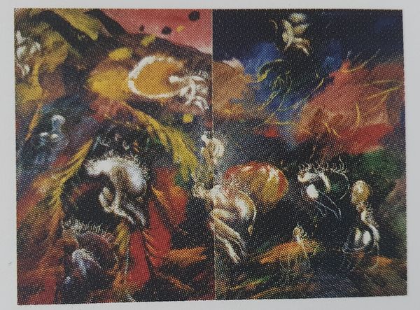 Editor: Here we have Oleg Holosiy's "Attiss" from 1989, a mixed-media piece including acrylic paint. I'm struck by the apparent duality here—almost as though there are two separate canvases. How does this visual division function, in your view? Curator: Holosiy's work, particularly from this period, exists within a fascinating socio-political context: the waning years of the Soviet Union and the rise of Ukrainian independence. This apparent "duality" might be less about separate canvases and more about reflecting the fragmented identity and conflicting realities experienced during this transitional period. The abstract expressionist style itself was seen, by some, as a Western, even rebellious, artistic language. Does this reading of resistance and subversion seem plausible? Editor: Absolutely. I can see that. The darker, chaotic mass on the right does feel like a suppression, and the lighter, almost ethereal section on the left, like a budding sense of liberation, as reflected by society at that time. But, how does the art world factor into his choice of style here? Curator: The art world both reflected and shaped these sentiments. Holosiy was part of a movement of Ukrainian artists pushing against socialist realism, embracing styles that allowed for individual expression and critique. These choices were inherently political statements, positioning them within a broader international discourse on freedom and artistic autonomy. Were there particular artistic institutions in Ukraine during this time, pushing towards freedom? Editor: I've read that private studios became very important at this moment as unofficial locations of production and freedom. Curator: Precisely! The work moves past being aesthetically intriguing to becoming a documentation and articulation of complex negotiations around national identity. The fractured composition echoes the splintering Soviet empire and the burgeoning, not-yet-cohesive identity of a newly independent Ukraine. Editor: That definitely reframes my understanding of the piece; it’s no longer just abstract, but socially charged. I'll consider this context next time I look at Holosiy's "Attiss." Curator: Indeed. The politics of imagery can truly amplify the voices of an era, creating new ways of considering the artwork.