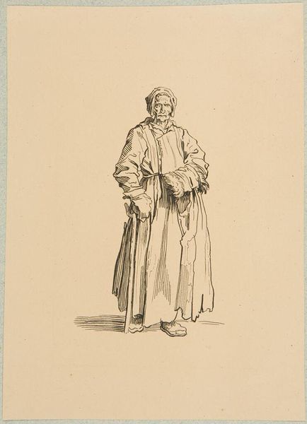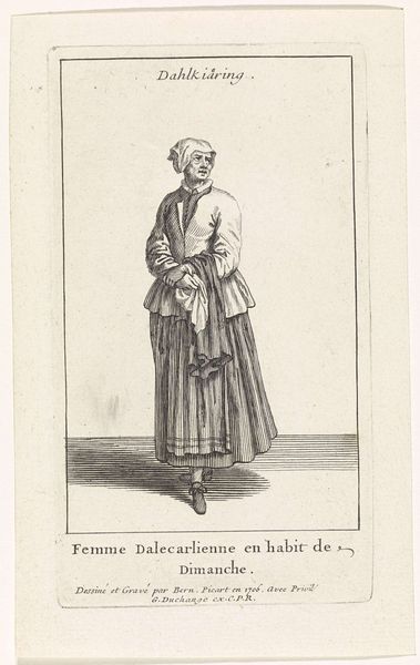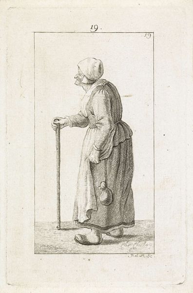 Editor: This is Thomas Worlidge's "Portret van Mary Squires," created between 1753 and 1755, currently held at the Rijksmuseum. It's an etching. The fine lines of the etching give it a delicate yet stark feel. I’m curious, focusing on the artistic merit, what draws your eye in this portrait? Curator: Indeed. Note how the artist employs line weight and density to articulate form. The varied etching strokes deftly render texture, from the rough fabric of Squires' clothing to the nuanced modeling of her face. Observe the strategic deployment of light and shadow achieved through this technique, creating a compelling visual drama. How does the relative balance of these effects inform our viewing experience, would you say? Editor: I see what you mean. The contrasting dark and light definitely define her face and clothing. So, beyond the technical skill, is the composition itself significant? The way she’s positioned, almost confrontational? Curator: Precisely! Consider the structural elements. The subject occupies a majority of the pictorial space. The artist directs the viewer’s attention through the carefully constructed composition, leading us to analyze her presence through the medium itself, the physical texture of the etching marks on the page, and the light as it renders them visible. It invites semiotic interpretation through structural means. The etching tool carves its statement to make meaning beyond representation. Would you agree that this tension serves a purpose? Editor: Definitely. Thinking about it that way, the textures almost create a story in themselves, even divorced from the subject's identity. It really makes you consider how the piece communicates beyond just being a portrait. Curator: Precisely. And how fortunate we are to witness.