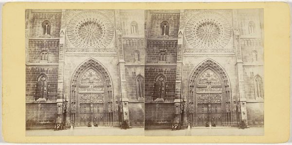 Curator: This striking photograph, "Zuidelijk toegangsportaal van de Dom van Keulen," captures the southern entrance of Cologne Cathedral. Attributed to Anselm Schmitz, it dates from around 1860 to 1870. Editor: It's powerfully symmetrical, a bit haunting even. The stonework seems almost fossilized in the sepia tones. I wonder, what type of photographic print is this? It’s remarkable how the details of the stonework are preserved. Curator: As a photographic print, it allows the gothic details, laden with symbolic meaning, to emerge into crisp detail. Notice how each archivolt is decorated. One could spend hours tracing the stories and biblical scenes crafted in stone that draw worshippers toward the portal. Editor: And all that labor! Think about the quarrying of the stone, the transportation, the carving—a monumental undertaking fueled by faith and skill. I find myself pondering the socioeconomic conditions that could produce such a structure and the artistry embedded in craftmanship. Curator: Precisely. The cathedral serves as a visual manifestation of communal belief and effort, rendered palpable. Each sculpted figure embodies narratives that speak to shared values and a celestial promise, reflecting a collective cultural memory. Editor: Right. Even the architecture is itself a technology—a means of material and social organization as much as religious expression. The photographic print extends that organization to distribution, access, consumption… Curator: And further cements these architectural marvels into the popular consciousness, inviting both contemplation and pilgrimage even through a simple photograph. It speaks to a lasting desire for transcendent experience. Editor: The act of preservation through the camera lens is key. It suggests both the fragility and the enduring power of materials, culture, and ideas to evolve into new meaning. Curator: I find myself more attuned to the way faith, expressed through art and architecture, speaks to human longing for a deeper connection with the divine. Editor: While I find myself wondering if there’s photographic evidence showing us some other cathedrals made of metal.