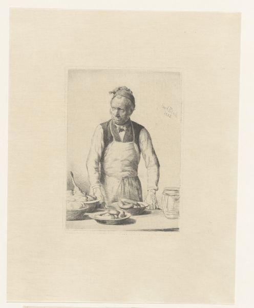 Curator: Let's discuss Carl Bloch’s 1882 etching, "The Food Seller Behind His Counter," which now resides at the SMK, the National Gallery of Denmark. It's a seemingly simple genre scene, but rich with possible interpretations. Editor: It certainly has a humble, almost stark quality. The figure seems burdened, not just by his apron but also by the world. The lines are so faint, it is like a whisper from the past. Curator: Absolutely, and in considering the time and social landscape of 19th-century Copenhagen, this work might be Bloch’s quiet commentary on class disparity. The man's weariness perhaps mirroring the lives of working-class individuals struggling to make ends meet. Editor: I’m curious about that burden you mention. Could the artist be implicitly challenging capitalist systems that push some toward precarity and marginalization? Does the artwork present a case for understanding dignity and representation through social class? Curator: Indeed, this seemingly innocuous scene can become a lens through which to explore themes of social injustice and representation. Consider the Realism movement that was gaining momentum then. Is Bloch using the guise of genre-painting to question the romanticism prevalent in the art world at the time? To suggest we should be looking at "real" people, the backbone of society? Editor: I think there’s definitely room for interpretation when observing his craft here too. In utilizing etching techniques, where the faintest details count to shape the character, the art might serve as a subtle assertion of labor rights at a time where Denmark was grappling with class tensions in society. Curator: Agreed. This piece prompts dialogue beyond just its aesthetic, becoming a portal for questioning socio-political paradigms. Editor: In essence, viewing this humble etching through a historical and theoretical framework amplifies its potential impact—reminding us of art's power to challenge and shape our perception of the world and power.