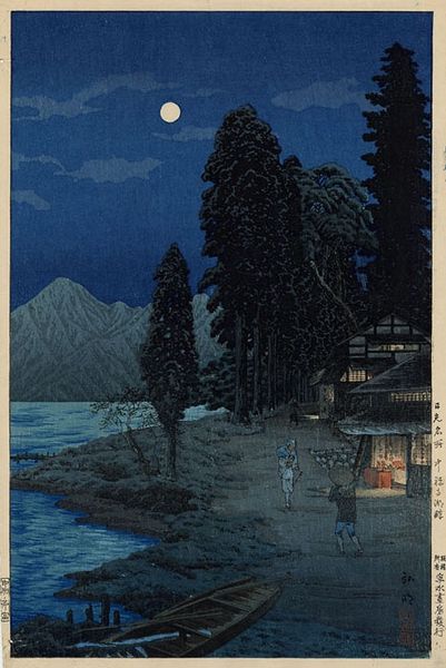 Editor: This is Hasui Kawase's "Spring Evening at Inokashira Park," a watercolor woodblock print from 1931. It has a strikingly serene mood, emphasized by the dominance of cool blue tones, but it's also subtly disrupted by the contrast of the trees reflecting on the water. What compositional elements stand out to you? Curator: I am particularly interested in how the composition directs the eye through the artwork. Notice how the artist uses the placement of the moon as a focal point, creating a visual anchor in the upper part of the piece. The rhythmic repetition of the trees and their reflections create a structured field, almost like a mirror image, prompting a conceptual relationship between reality and image. How does the scale of the artwork inform your understanding? Editor: It being a print, and thus likely fairly small, makes me consider intimacy and the everyday, rather than grandeur. Do you think the texture created through the woodblock print medium affects the artwork’s expression? Curator: Yes, undoubtedly. The grain of the woodblock enhances the texture and depth of the artwork, particularly evident in the rendering of the water's surface. Each line contributes to a complex surface of visual sensation. It contrasts beautifully with the smoother rendering of the moon. Editor: I hadn't considered that contrast of textures, that really changes how I see the piece. Curator: These deliberate tensions—between the micro and macro of texture and tone—demonstrate how the artist actively shapes our engagement with the represented scene. Thinking critically about the form allows a deeper consideration of content. Editor: It's amazing how formal analysis reveals such richness. Curator: Indeed. Understanding art requires appreciating the artist’s intent in using every tool, line, and shade.