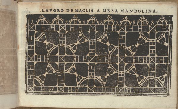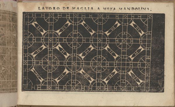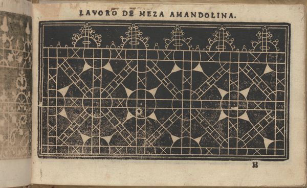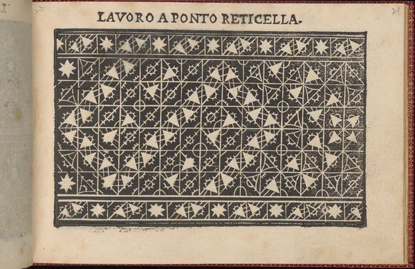 Curator: Here we have a page, specifically page 31, from "Studio delle virtuose Dame" or "Studio of Virtuous Women," created in 1597 by Isabella Catanea Parasole. Editor: Immediately, I'm struck by how incredibly graphic it is! The sharp contrast between the black ground and these intricate white patterns. It has an almost hypnotic quality. Curator: Indeed. What we're seeing here is a drawing intended as a print, meant to act as a pattern book for lacemaking, specifically “Ponto Reticella” or needle lace, a very popular pastime of noblewomen during the Renaissance. Editor: Ah, now that gives me a symbolic framework. Geometric shapes and grids are often interpreted as representing order, precision, even social structures. Did the specific arrangement of these patterns hold particular cultural significance? Curator: The designs are interesting as examples of artistic labour made specifically for other labourers, in this case, the noblewomen or ladies that were Parasole's clients and students, offering new patterns which served both a practical and pedagogical purpose. The patterns here feature geometric forms like circles and triangles combined to produce intricate stylized florets. Editor: I find it interesting that there is also a symbolic connection to domesticity, femininity, and skill; yet, beyond all of those ideas, there is also an expression of Renaissance ideas in those repeating star or flower like figures that form this pattern for this laborious, skillful activity. Curator: Absolutely. Parasole wasn’t merely creating craft patterns; she was, as you mentioned, encoding cultural values related to labor and gender. And let’s not forget the cost. The raw materials, the cost of training with an expert designer, the amount of time required to create. That created an exclusive market to upper class families that other women were excluded from due to its cost. Editor: It brings into relief that a lot of what defines our visual culture and expression as it relates to design and the "lesser arts" began as coded language in pattern. Curator: A visual record of material production and artistic practice accessible even today. Editor: The power of a simple pattern, isn't it amazing?