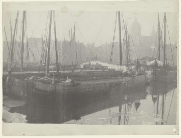 George Hendrik Breitner made this photograph, "Ships on the Damrak in Amsterdam," using gelatin silver print. The beauty of photography lies in its chemical processes, and the way that light interacts with treated surfaces, with the appearance of Breitner's image dependent on these elements. The muted tones and soft focus give the scene a sense of immediacy, as if captured in a fleeting moment. The gelatin silver printing process allows for a wide range of tonal variations, which Breitner uses to create a sense of depth and atmosphere. Beyond aesthetics, the photo encapsulates a specific time and place, reflecting Amsterdam's maritime industry. The Damrak, a bustling harbor, shows the labor and trade integral to the city's economy. The photograph becomes more than just a pretty picture. Ultimately, the significance of "Ships on the Damrak in Amsterdam" extends beyond its visual appeal. It serves as a reminder of the interconnectedness between art, labor, and social context.