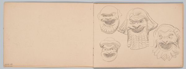 Curator: Here we have a delightful ink drawing on paper, “Comical Demon Mask,” created by Matsumura Goshun in the late 18th to early 19th century. Editor: It’s just…joyful, isn't it? Like a gremlin who’s pulled off the prank of a lifetime. The whole thing’s imbued with this gleeful, mischievous energy, wouldn't you agree? Curator: Yes, that is perceptible at first sight. The stark contrast achieved using only ink emphasizes the exaggerated features of the demon mask, in particular, the intense eyes and broad grin, elements perhaps used by Goshun to signify deeper psychological facets. Editor: I reckon that wide, toothy grin just jumps right out, doesn’t it? The artist used a stark palette of just black ink over the buff tone of the paper which focuses my gaze intensely to that madcap grin. Almost manic! Curator: Indeed. The simplicity of the ink drawing style is, in fact, central to the Ukiyo-e tradition. The use of line becomes critical to the visual and symbolic structure here. Consider the economical but assured strokes, denoting not just form but, as we noted earlier, its spirit and essence. Editor: I find its positioning intriguing as well! Look at how the face is positioned off to the right side. That creates a fantastic feeling of movement in the picture; it feels like this wacky critter might zoom off the page any second! Curator: An astute observation. The asymmetry brings the piece to life and suggests this drawing should be situated as part of a dynamic, ongoing narrative. The artist seems to invite active rather than passive viewing. Editor: Thinking about it, it isn't truly frightening, even though it's labelled a "demon." I am amused by its boldness more than anything else! Curator: Agreed. Goshun here skillfully used reduction to communicate layers of sentiment and provoke thoughts around the art of demonizing as humorous. Editor: I really feel there's more than just the outer shape; in those eyes and teeth, there’s also some hint of our own internal goofball looking back at us. What do you think? Curator: You propose an intriguing psychological reading. Certainly the artwork invites just that. Editor: Looking at it this closely made me see so much hidden comedy in what initially seemed a really direct visual gag! What a playful character!