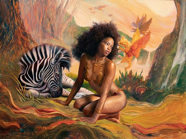 Kehinde Wiley made this painting, Saint Jerome Hearing the Trumpet of Last Judgment, using oil on canvas. There’s a real push-pull here between the figure and the background, a dynamic tension which I think is so interesting. Wiley builds up the figure with many thin layers of paint, almost like glazing, which gives the skin a luminous, lifelike quality. But then you have the patterned background which is flatter, more decorative, a kind of wallpaper effect. The figure emerges from this almost overwhelming pattern. I love how he makes use of the tradition of portraiture, playing with ideas of power, identity and representation. The way the vines creep over the red fabric, connecting it to the verdant background, it’s like nature is reclaiming the scene, blurring the boundaries, reminding us that things are never quite fixed. Think about someone like Chris Ofili whose paintings also explore identity, history, and ornamentation. With Wiley, there's a sense of art being an ongoing conversation, a dialogue across time and cultures.