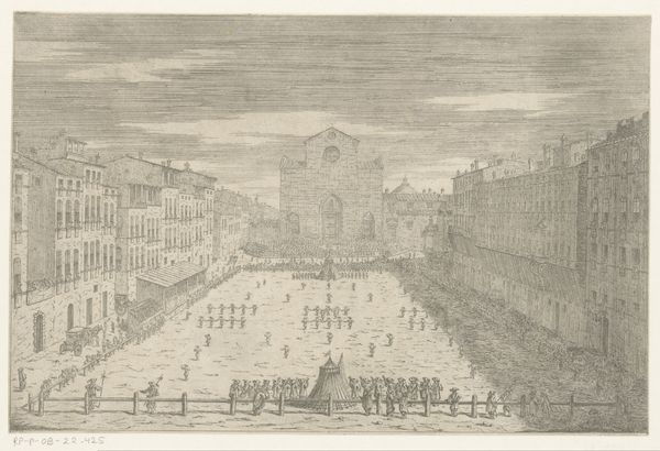 Editor: This engraving, "Gezicht op het Piazzetta te Venetië," dating roughly from 1570 to 1660 by an anonymous artist, presents a fascinating view of Venice. The architectural precision is quite striking, almost mathematical in its detail. What compositional elements stand out to you? Curator: Immediately, the linear perspective asserts itself, drawing the eye deep into the pictorial space. Consider how the orthogonals of the buildings converge towards a vanishing point, structuring the entire composition. Do you perceive any deviations or artistic licenses taken with this rigid structure? Editor: I notice the figures are tiny, and sort of flattened. Almost like afterthoughts rather than integral to the architectural accuracy. Curator: Precisely! The figures function less as individualized forms and more as visual elements that articulate scale and reinforce the monumentality of the buildings. Consider the contrast in the handling of line: controlled and precise for architecture, more gestural for the figures and clouds. What does this contrast suggest about the artist's priorities? Editor: Perhaps the artist intended to show off the grandeur and permanance of Venetian architecture rather than capture its ephemeral, human element? Curator: Indeed. Observe, too, the intricate detail given to the surface textures of the buildings versus the relatively simple rendering of the sky. The interplay of light and shadow, rendered through the density and direction of the engraved lines, creates a palpable sense of depth and form. This creates not just an image, but an exercise in perspective itself, an early study. Editor: That's a different way to approach landscape art. Now I am more interested in geometric precision. Curator: A fresh lens allows us to re-evaluate the visual organization. The architecture in Venice offers much material to explore for that scope.