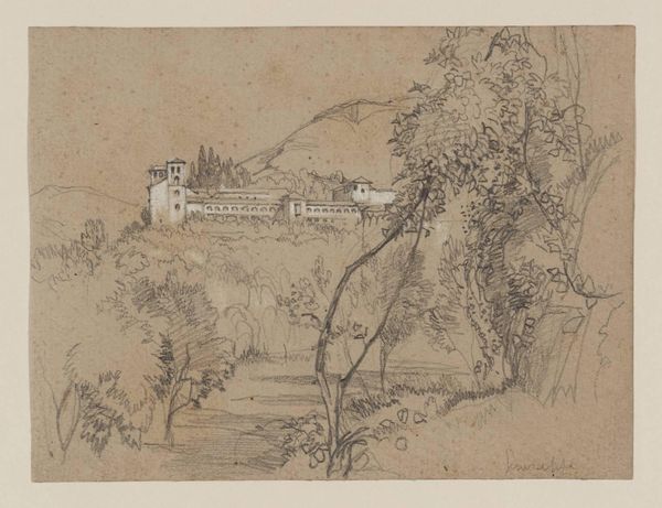 This is a pencil drawing by Willem Roelofs titled 'Huis in een landschap bij Bois Marteau', housed here at the Rijksmuseum. The sketch invites us into a landscape, defined by a gentle slope, crowned with trees. A small house nestles at the base of this rise, seemingly embraced by the land itself. Roelofs employs a light touch with his pencil, using delicate, meandering lines to define form and space, which creates a sense of openness. The composition guides our gaze from the lower foreground where the house sits, upwards and into the expansive background, and even beyond the scene itself. The varying densities of pencil strokes generate volume, shaping the undulations of the landscape, and casting shadows that add depth and a sense of temporality. We are invited to consider how the structure of the drawing, with its emphasis on line and spatial arrangement, reflects a broader artistic interest in the natural landscape and our place within it.