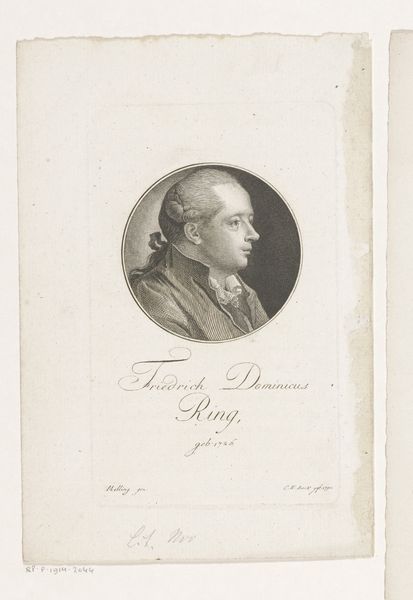 This is Christoph-Wilhelm Bock's portrait of Johann Friedrich Degen, rendered in etching. The composition is immediately striking for its play with geometric forms. The subject, Degen, is neatly encapsulated within a perfect circle, a shape often associated with wholeness and perfection. This circular boundary creates a sense of containment, focusing our attention sharply on the profile of the man. The stark contrast between the dark etching and the stark white background generates a visual tension. Bock masterfully employs hatching and cross-hatching to model Degen's features and clothing, creating a sense of depth and texture within the flat plane of the print. This technique allows light and shadow to define the contours of his face, capturing a sense of his character. The portrait is further stabilized by the neat, linear inscription of Degen's name beneath the image. The use of the circle against a rectangular plane invites us to consider how the artist frames identity. The crisp lines and controlled execution reflect an era deeply invested in order, reason, and the clear demarcation of social roles.