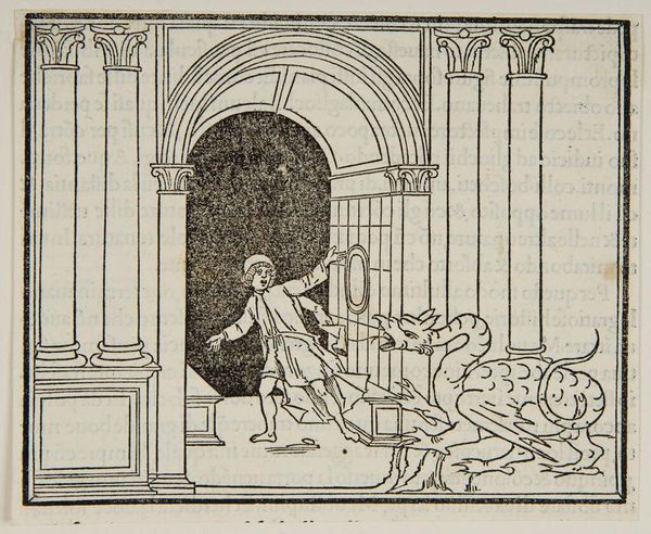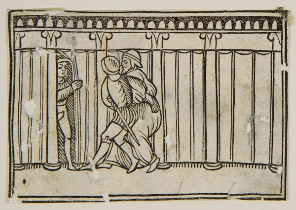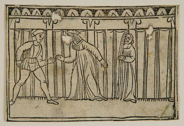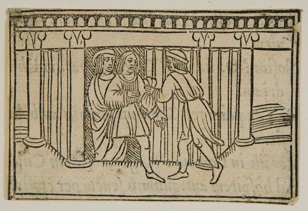 Editor: This anonymous piece, "Book VII.4. Marcus Pomponius is threatened by Titus Manlius," depicts quite a tense scene, doesn’t it? It's fascinating how the artist captured so much drama with simple lines. What stands out to you about the materials and production of this image? Curator: The woodcut medium itself speaks volumes. Its accessibility meant this narrative, and likely the book it's from, could reach a wider audience. Consider how this mass production, this democratization of images, shifts power dynamics. Who is consuming this, and what action might they take? Editor: That's a perspective I hadn't considered. It makes you wonder about the social impact of affordable artwork. Curator: Exactly! Think about the labor involved, the wood, the ink, the press. It's not just about the image; it's about the means of its creation and dissemination, and what social commentary it inspires. Editor: I see what you mean. Thanks for opening my eyes to that. Curator: My pleasure. It's crucial to remember that art is rarely divorced from the socio-economic realities of its time.