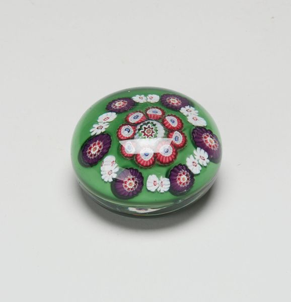 This captivating paperweight, crafted anonymously, showcases a mesmerizing array of floral patterns encased in glass. At first glance, the concentric circles of flowers evoke mandalas, ancient symbols representing the cosmos and psychic wholeness. Consider how similar motifs appear in Byzantine mosaics or Persian carpets, where the organization around a central point symbolizes order and harmony. The flower, a symbol of both beauty and transience, carries a psychological weight, reminding us of life's fleeting nature. The paperweight invites contemplation and an almost meditative state. Yet, the recurring floral motif also speaks to the cyclical nature of existence. Like the ouroboros, the snake eating its tail, these patterns return in countless forms across cultures. This paperweight embodies not just a single moment of artistic creation, but a timeless echo of symbols that resonate within us, connecting our present to the vast expanse of human history.