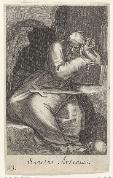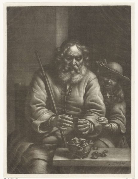 Editor: This print, "Rokende oude man warmt zijn handen" by Wallerant Vaillant, probably made between 1658 and 1677, presents an intimate scene of an old man smoking. The soft grays and blacks give it a feeling of quiet contemplation. What cultural symbols do you see present in this artwork? Curator: What immediately strikes me is the pipe itself. Beyond the obvious association with smoking, the long-stemmed pipe held by the elder suggests contemplation and perhaps wisdom earned through years. Think about the rituals associated with pipe-smoking, of reflection. The communal aspect also suggests a sharing of knowledge and tradition from one generation to the next. Can you see that connection? Editor: Yes, I can see that, especially given the young boy standing nearby. What does that say about the man and boy connection? Curator: Notice how the youth seems to mimic the man’s gesture, a playful echo of the elder's wisdom and habit. This kind of copying acts to highlight the perpetuation of social and cultural practices across generations, suggesting a cycle of imitation and eventual inheritance of responsibility. Are the figures isolated, or do you think they feel connected in some way? Editor: It’s a complicated picture. Even though they are positioned close to each other, their faces convey different messages. But you are right, the boy's gaze does echo, somewhat, the man's concentration on smoking. I think, they feel connected by more than blood ties. It also strikes me, the print does an incredible job of using light and shadow to create this moody, introspective moment. Curator: Precisely. Think too about how images and visual symbols solidify cultural memories and collective understanding. This Dutch Golden Age genre scene invites a shared understanding and sentiment that viewers could relate to, creating cohesion and communal values. Editor: It's fascinating to think about how much symbolism is embedded within seemingly simple, everyday images. Thanks to you, I now recognize its narrative strength, rather than simply its literal portrayal of a smoking man. Curator: Exactly. Now consider how prevalent such representations were, contributing to an overall cultural memory.