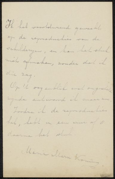 Curator: This work, titled "Aantekening," roughly translated to "Note," is attributed to Philip Zilcken and dates between 1867 and 1930. It's a mixed-media piece, primarily ink on paper, and currently held here at the Rijksmuseum. Editor: My first impression is one of quiet intensity. The subtle tones of the ink and paper create a somber mood, while the handwriting itself seems hurried, frantic almost. Curator: Exactly. Handwriting is always imbued with the personal; its legibility dictates our immediate reading. But what do we, who likely don’t read this language fluently, truly receive? Are we then just as much beholding a type of mark making and image? Do we impose meaning beyond recognition, and how does this relate to identity formation, especially considering Zilcken's potential status and the historical backdrop of burgeoning modernism? Editor: That's interesting. I'm struck by the physical process – the ink bleeding into the paper, the pressure applied by Zilcken’s hand. The choice of materials—paper and ink, easily accessible yet also historically loaded—speaks to the very act of inscription, a foundational human endeavor. The abstraction invites reflection upon those modes of artmaking available. I can't help but wonder what the availability of these media dictated about Zilcken’s artistic capabilities? Curator: Precisely, it's a window into Zilcken’s thought process, his engagement with language, and even his social milieu. Consider the politics embedded in mark making, of writing as assertion, both the freedom and constraint inherent in wielding these materials in late 19th-early 20th century Europe. The work can serve to disrupt and even destabilize how we perceive societal authority. Editor: I see your point. We often overlook the labor inherent in textual creation, particularly handwritten works like this. The imperfection, the fluidity – these speak volumes about the lived experience. Curator: Absolutely, it allows us to explore power structures and deconstruct the myths around authorship and artistry in a time when ideas about the modern were forming. Editor: A compelling consideration of process that reveals the social underpinnings of even a seemingly simple note. Curator: A rich example of an aesthetic document from the fin de siecle.