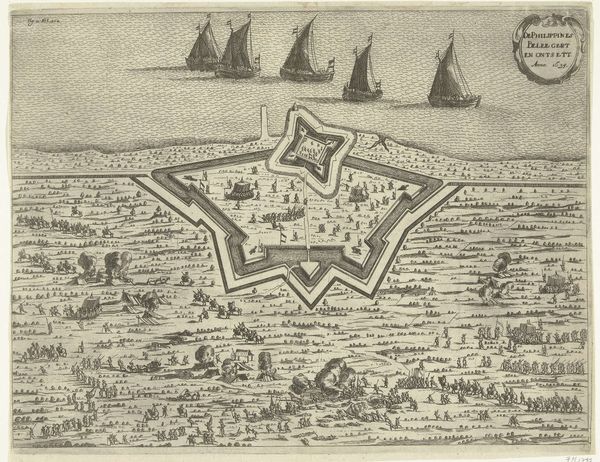 Curator: This engraving is entitled "Plattegrond van een bouwplaats met werkzaamheden nabij Katwijk-aan-Zee", or "Map of a Construction Site with Activities near Katwijk-aan-Zee". It's by Isaac Weissenbruch and the Rijksmuseum dates its creation sometime between 1836 and 1912. Editor: It feels… distant. All the little figures rendered with such a light touch, yet teeming with activity. Almost like ants building their colony, the sheer amount of work seems overwhelming. Curator: Exactly! Weissenbruch captured the bustling energy of the building site near Katwijk aan Zee. It’s interesting to note the materials deployed—the textures of sand and water achieved solely with lines, reflecting printmaking's reliance on economical mark-making to create detailed environments. Editor: And who exactly is benefitting from this labor? Looking closer, there’s a sense of the military-industrial complex here. Fortification walls being built. Resources being deployed. Are these the foundations of Dutch maritime power in some way? Who gets protected, who profits? Curator: Those are crucial questions. We have to think about the socio-political backdrop. Was it commissioned, or a personal project documenting industrial advancement? These details influence our interpretation. And to see it as purely utilitarian would overlook Weissenbruch's compositional choices. The panoramic view elevates the scene, suggesting progress, ambition… Editor: Ambition, certainly, at a potential cost. Notice the small scale of the workers against the looming fort and barren landscape. It speaks volumes about individual agency against systemic forces. It makes me wonder about their lives, their working conditions, the very real possibility of exploitation underpinning this depiction of progress. Curator: That's why linking this piece to its historical moment is so vital. Considering how social upheavals, class dynamics, and industrial conditions impact Weissenbruch's choices broadens our grasp of the artwork, it prevents us from seeing simply an antiquated picture and lets us read a multilayered commentary on a specific society. Editor: Agreed. Viewing it through this lens definitely gives more texture. No mere charming tableau. I see now much darker shadows here. Curator: Exactly! Editor: Well, thank you. I am definitely walking away from it now with more to ponder.