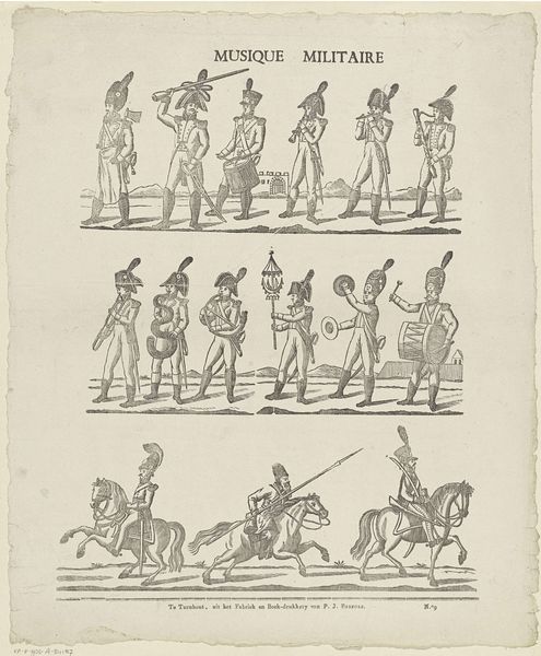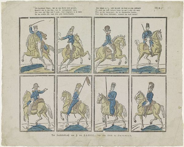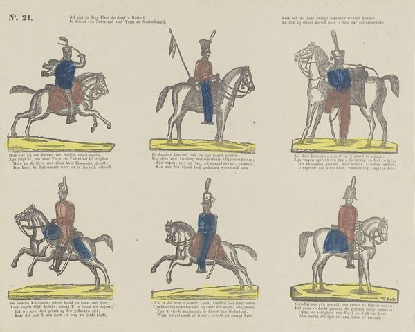 This print of soldiers was made by Jan de Lange II, a bookseller and printer operating in the Netherlands in the first half of the 19th century. The image is a wood engraving, with hand-applied color. Wood engraving is a relief printing technique, in which the artist carves an image into the end-grain of a block of wood. The areas that are cut away do not receive ink, while the raised areas do. The block is then inked and pressed onto paper. The resulting print has a distinctive graphic quality, with crisp lines and a slightly textured surface. Because it was relatively inexpensive, it was ideally suited to the production of printed ephemera: precisely the kind of imagery that would have been sold by someone like de Lange. It’s important to recognize that even seemingly minor works like this one depend on both artistic skill and significant networks of distribution. It is through such artifacts that social and political identities are produced and circulated.