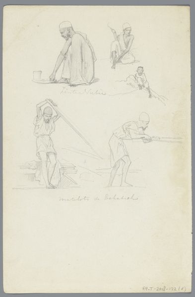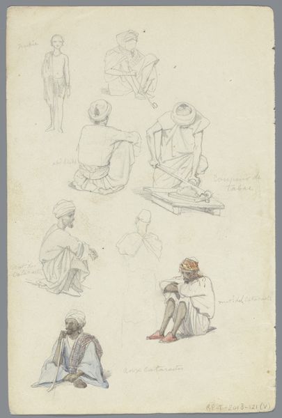 Curator: This is Willem de Famars Testas' "Five Studies of Egyptians and Two Heads Ditto", a pencil drawing dating back to around 1858-1859. It's currently part of our drawings collection. Editor: The first thing that strikes me is the seeming lightness, almost ethereality of it. The pencil work creates a sense of movement and fleeting observation, almost like capturing a series of moments. Curator: Absolutely. Testas was deeply interested in Orientalism, and this drawing provides a fascinating window into how Egyptians were viewed and depicted during that period. He's capturing a visual inventory, almost like a collection of ethnographic specimens, if we’re being critical. The artistic intention reflects both documentation and exotification. Editor: Thinking about the material – just pencil on paper – makes me consider its immediacy and the potential accessibility of the artistic process itself. This wasn't a commission of precious metals or lavish oils; this was a readily available, humble medium. Does that contribute to a sense of the "everyday" in his depictions, despite the Orientalist lens? Curator: I think that’s a valid point. The choice of medium arguably emphasizes a documentary approach but perhaps obscures how class dynamics, power, and colonialism were literally inscribed onto those Egyptian bodies, translated through Testas’ own European positionality and perception. Editor: And what do we know about how these studies were actually made? Was it on-site sketching, or were these compiled later, perhaps in a studio from other visual sources? It shapes how we read the work, as on-site would embed an encounter while working from secondary images highlights the distance in perception and interpretation. Curator: Archival information shows that he traveled extensively through the region. We believe it’s safe to assume he created these studies whilst encountering these people, in Egypt. But the question of how direct those interactions were, how reciprocal, still stands. His visual language reinforces existing stereotypes, ultimately reflecting the exoticising male gaze that permeated artistic expression during his period. Editor: Seeing these quick strokes, this method of almost immediate reproduction, does make me think of labour, the swift translation of observed human forms, almost production line style to churn out this image which eventually others then consume… Thank you, that perspective has changed my understanding of this study. Curator: Glad to offer my reading, just like a reminder to myself to constantly challenge dominant cultural paradigms and ask who has the power of representation in the history of art.