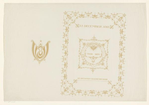 Curator: This intricate pen and ink drawing is a design by Reinier Willem Petrus de Vries, created in 1913. It’s titled “Ontwerp met bladdecoratie voor de Vereeniging voor den Effectenhandel,” which translates to "Design with leaf decoration for the Association for Securities Trading.” Editor: My first thought is, what a fascinating glimpse into the visual culture surrounding early 20th-century finance. There's an air of solemnity and officialdom but softened by the delicate leaf patterns. Curator: Yes, there’s a formality inherent in its purpose. It likely functioned as an invitation or program cover for the Association’s event, as noted by the text 'De Ontvangst Geschiedde Door', which means "The reception was hosted by." The leaf motif resonates with themes of growth, prosperity, and stability. These kinds of natural symbols are pretty common to convey an impression of wealth and well-being. Editor: It makes you wonder about the intended audience, the stakeholders of this association. What did that era and this Art Nouveau style say about wealth and value to them? The fact that this is handmade adds an additional dimension: was it exclusive to higher-ups? The visual grammar speaks of class, maybe exclusion. Curator: Absolutely, the handmade quality contributes to the exclusivity. And while the Art Nouveau style evokes organic growth and flow, notice the grid underneath the decor: perhaps the visible pencil lines suggests control, like cultivation and manipulation as well, hinting at constructed markets rather than something grown freely. The controlled chaos! Editor: The decorative framing is particularly intriguing too. There's a repetition and symmetry that perhaps unconsciously reinforces systems and structures of financial exchange as ordered, reasonable…when, of course, financial realities can be far messier. Curator: I agree; the borders provide a contained and controlled presentation, a way to make something volatile feel safe. The central logo's leaf pattern has that very controlled design that looks to give an assurance to members of stability, progress, a bit of modernity even. Editor: For me, seeing this juxtaposition of nature and high finance encourages deeper questions about capital itself: Who benefits? At what expense? How does power and ideology intertwine within systems that claim to be apolitical? Curator: Exactly, these visual markers of value open conversations about the values we attach to capital and what those values signify culturally and politically. Editor: A reminder that images are never neutral and offer a glimpse of past meanings still in play today. Curator: Indeed. It showcases that finance, just like anything, operates within a culturally shaped and visually represented world.