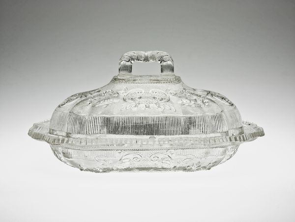 Curator: That’s lovely. Looking at this image, I’m immediately struck by its delicateness and intricate textures. There’s something almost ethereal about the way the light plays on the glass. Editor: Indeed. What we're observing here is a "Covered Vegetable Dish" crafted around 1840 by the Boston and Sandwich Glass Company. Now on display at the Minneapolis Institute of Art. Curator: A vegetable dish… It speaks volumes about class, doesn't it? Something so commonplace, elevated through glass. And the method of production, too—I’m betting pressed glass, making what appears high-end more widely accessible. Editor: Exactly. The piece reflects the democratization of luxury during that period, where industrial advancements made finer goods available to a burgeoning middle class, subtly reshaping dining rituals. What’s being served, and how, becomes symbolic of one’s social mobility. Curator: How interesting that advances in manufacturing led to democratization, though undoubtedly at the expense of the labor of the glass workers, yes? This period saw immense change, from independent artisan shops to factories with wage laborers who had less say in what they created. I wonder, do we know how involved the makers were in designing the pressed patterns or controlling production at all? Editor: While records don’t highlight individual makers consistently, museum collections like these perform a function in assigning social and cultural value that in turn shapes how this history gets remembered. Exhibiting pieces like these—utility elevated by skillful manufacture—offers avenues to discuss evolving tastes and socio-economic conditions of that era. Curator: I do appreciate how it complicates our ideas about art and function and access and artistry, simultaneously. It challenges the way we assign significance through social practices. Thank you for that insight. Editor: My pleasure; I believe it prompts essential inquiries into how society assigns and celebrates worth within shifting parameters.