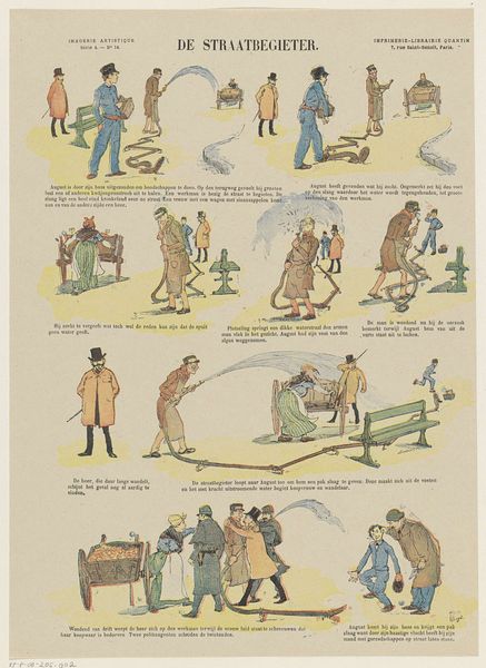 Editor: So this is "Tom en de blinde," dating sometime between 1876 and 1890. It's a print, and I'm immediately struck by its comic-strip style, all these little scenes playing out. There's a definite… well, mischievousness to it, right? How do you interpret this work? Curator: Oh, mischievousness is a perfect word for it! But beneath that light-hearted surface, I see something deeper, perhaps a reflection on societal dynamics. Consider the characters—Tom, the cheeky boy, and the blind man, presented, dare I say, a little stereotypically. Editor: Right, like an older Dutch comic? There is definitely something nostalgic and classic about it. Curator: Precisely! Notice how the narrative unfolds through sequential scenes, each capturing a moment of Tom's...interactions with the blind man. What strikes you about their interactions? Editor: Well, Tom seems to be constantly pranking him! Tripping him, tricking him, generally being a bit of a menace. It’s not exactly kind. Curator: Indeed. Is it simply a reflection of boyhood antics, or does it offer commentary on power, vulnerability, and how society treats those who are different? I wonder… could there be something more to that adorable white poodle as a metaphor? Editor: That’s a fascinating point. I initially saw it as just a funny, light-hearted series, but thinking about it now, there's definitely a darker, more critical edge. Curator: And that, my friend, is the joy of art. It holds a mirror to our world, inviting us to question, reflect, and see beyond the surface. Each viewing may uncover a new hidden truth, perhaps even of ourselves.