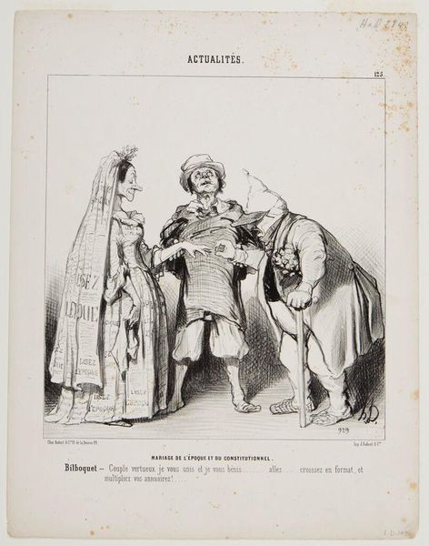 Honoré Daumier created this lithograph, Mariage de l'Époque et du Constitutionnel, during a time of immense political and social change in France. It serves as a satirical commentary on the uneasy alliance between two newspapers of the time. The artwork cleverly uses the visual metaphor of a marriage to critique the press. The bride, representing L'Époque, is adorned in a gown printed with headlines, symbolizing the superficial nature of the press. The groom, Le Constitutionnel, is portrayed as a rather aged and weary figure, suggesting a paper clinging to traditional values, perhaps past its prime. This union seems less about love and more about political expediency. Daumier often used his art to challenge the status quo. His work highlights how media can be manipulated to serve political agendas, thereby shaping public opinion. This print allows us to reflect on the complex relationship between media, power, and the public. In the end it compels us to consider whose interests are truly being served.