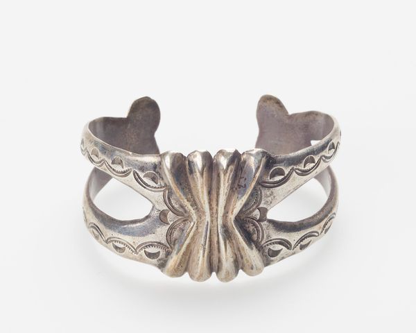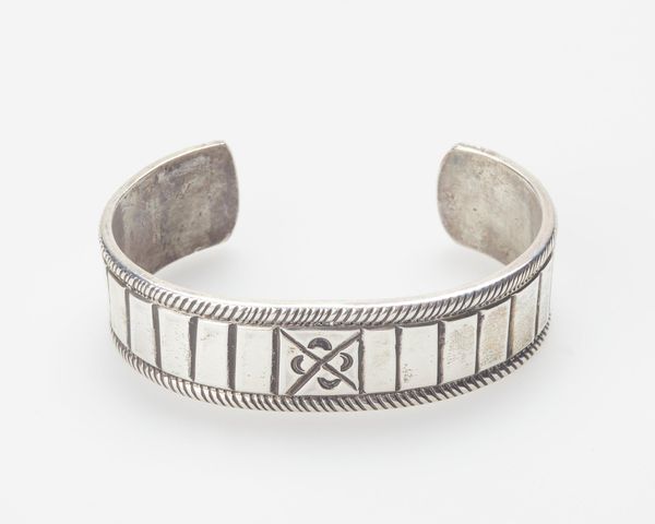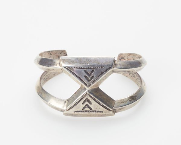 Curator: This is a Diné, or Navajo, silver bracelet dating to the 1950s, now held in the collection of the Minneapolis Institute of Art. Editor: Immediately, I notice the repetitive geometric pattern, creating a sort of visual texture, almost like woven metal. Curator: Woven is a great descriptor, as it reflects the longstanding Diné tradition of weaving textiles and basketry; we see these motifs transferred beautifully into silverwork. The 1950s, of course, were a complicated period for Native Americans in the U.S., marked by government policies of assimilation. Artistic expressions like this bracelet became important statements of cultural persistence and adaptation. Editor: Adaptation is key. There's a blending here—the distinctly Native artistry rendered in a material, silver, often acquired through trade. The cool, muted tones enhance that metallic texture, the subtle dents and scratches telling a story of use and time. It feels solid and grounded, almost architectural in its construction. Curator: Exactly. This was not merely adornment; it represented economic power, artistic innovation, and connection to cultural heritage during a time of social and political pressure. Each mark upon it speaks to complex histories. Wearing such a piece becomes a way of carrying that history, both visibly and intimately. Editor: And structurally, the cuff's wide form makes such a strong statement. This single piece could define an entire look. I am compelled to keep visually tracing the artist’s lines and textures. Curator: Indeed. By focusing on its historical place we acknowledge this object as a signifier, as a complex symbol that merges both personal aesthetics and communal experience. Editor: Analyzing form alone brings only an incomplete understanding. Seeing it through that critical and expanded cultural lens is vital, as it allows us to more fully acknowledge what this work truly represents.