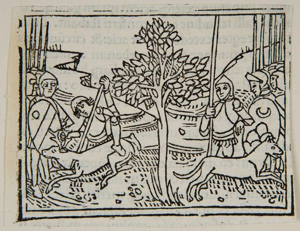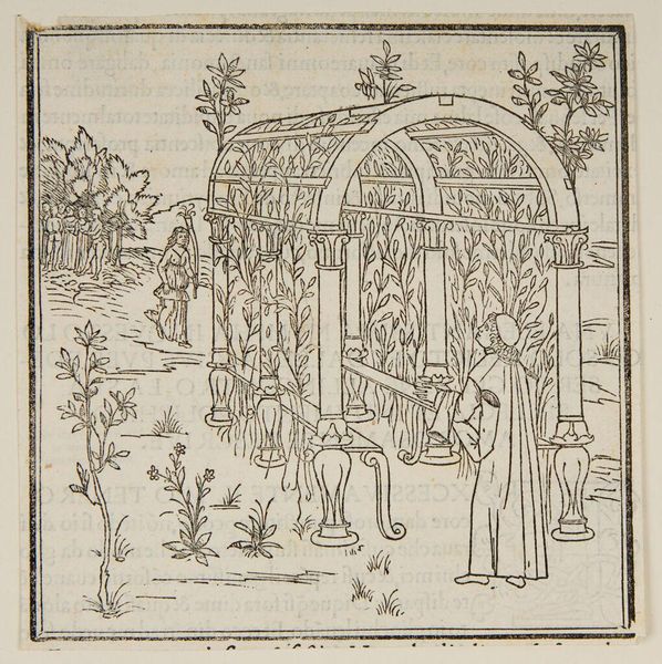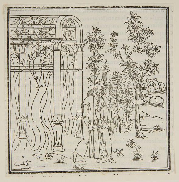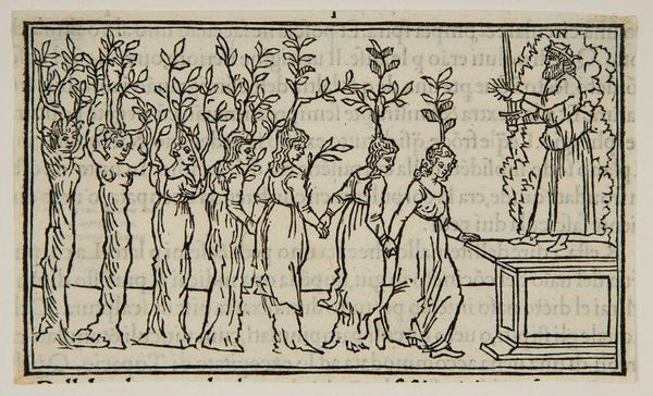 Curator: This image, entitled "Poliphilus meeting five nymphs," is a fascinating woodcut. The artist is currently unknown. Editor: It’s an oddly serene image, despite the somewhat stiff figures. There's a real sense of classical idealism here. Curator: Absolutely. Consider the narrative: a man encountering nymphs. We see gender and power dynamics, the male gaze versus female autonomy. What cultural stories are at play here? Editor: The nymphs carry a vase and a stringed instrument, symbols of art, music, and ritual. Notice how their gaze seems to challenge Poliphilus, even the viewer. There is a strong female presence. Curator: I’m intrigued by its use of line, its graphic quality. It is a powerful statement on historical representation and gender. Editor: This encounter, so carefully rendered with symbolic weight, really makes you consider the weight of cultural memory. Curator: Indeed. This woodcut offers us a glimpse into the complexities of historical narrative and representation. Editor: It’s a reminder that images always hold many layers of meaning.
