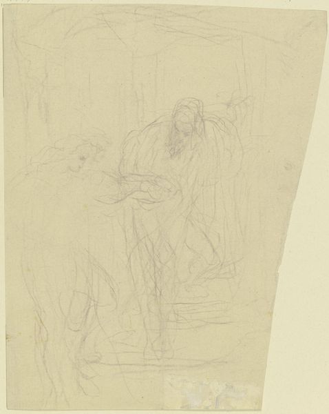 Editor: This is Victor Müller's drawing, "Ritter Hartmut von Kronberg bei dem Reformator Oecolampadius in Basel," created around 1866 or 1867. It’s done in pencil and ink on paper. I'm immediately struck by the almost ghostly quality of the figures. The lines are so light, it feels like a memory more than a depiction. What pulls you in when you look at this piece? Curator: It whispers secrets, doesn't it? Like eavesdropping on a pivotal moment in history, only the story's half-remembered. To me, it's a fantastic exploration of faith, power, and the very human act of wrestling with beliefs. Notice how Hartmut, the knight, seems almost caged by his armor even though the lines depicting the figures are ephemeral. It hints at the constraints of his position, doesn't it? And Oecolampadius, frail but firm, holds his ground. What do you think about that architectural background seeming both present and dissolving? Editor: That tension is great. It’s like the solid reality of Basel is fading as this debate intensifies! But is that third figure? Curator: Ah, a spectral witness. I imagine them as the silent observer, the embodiment of public opinion, maybe? Müller loves to toy with these ambiguities. Isn't it clever how he uses such delicate lines to suggest such monumental ideological clashes? It’s as if the Reformation itself is hanging in the balance, etched in the faintest of ink. Where do your eyes keep going back to? Editor: Definitely to the knight. He seems caught between worlds, like the old order is literally weighing him down. I guess I expected something a bit more... finished. Curator: But that’s its magic! It's unfinished *thoughts*. Art isn’t about conclusions; it’s about the messy, exhilarating, sometimes frustrating, process of questioning, much like the Reformation itself, really. Editor: Absolutely. This glimpse into Müller's process really reframes how I see the finished history painting he may have envisioned. Curator: Right? The ghostliness becomes a kind of truth. And that’s a beautiful thing, isn't it?