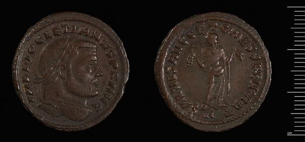 Editor: This is a Follis of Constantius I, from Antioch. What immediately strikes me is the presence of the Emperor and the goddess on the other side. How do we understand this kind of imagery in the socio-political context of the Roman Empire? Curator: This coin presents us with a fascinating intersection of power, divinity, and identity. The representation of Constantius alongside a goddess wasn't merely aesthetic; it was a carefully crafted message. Can you think about who these coins were meant to reach, and what messages the ruler intended to communicate? Editor: Well, I suppose everyone? But what would that message be? Curator: Exactly! This coin speaks to the crucial role of imperial propaganda in shaping public perception and legitimizing rule. The fusion of divine and imperial imagery reinforced the Emperor's authority. It was a calculated visual language to project power and stability. What do you make of that? Editor: It's interesting how art was actively used as a tool for social control and influence. I guess I never considered coinage in those terms. Curator: Precisely. Studying the Follis of Constantius I allows us to understand the complex power dynamics at play within the Roman Empire and the ways in which identity was constructed and disseminated through material culture.