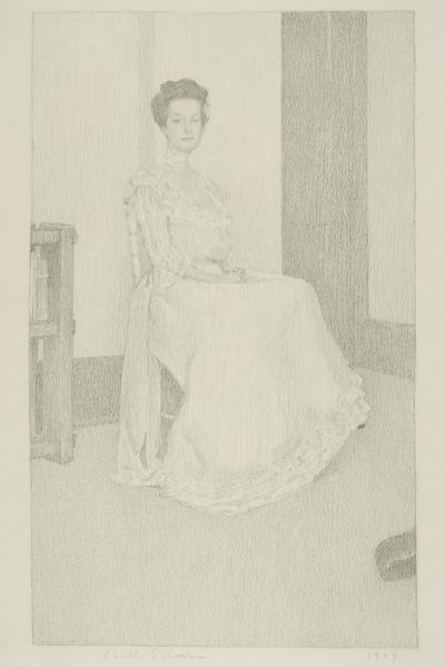 Editor: This is Donald Shaw MacLaughlan's "Drypoint Number Three: Portrait" from 1909, currently at the Art Institute of Chicago. The fine lines almost vibrate on the paper! What's striking to me is how he’s captured a real sense of stillness, even with such active mark-making. What stands out to you? Curator: The success of this piece, and indeed drypoint as a medium, lies precisely in that contrast you identify: the tension between delicate detail and a sense of immediacy. MacLaughlan coaxes considerable tonal variation from such simple means, wouldn't you agree? Editor: I do! But how does that variation function? Curator: Observe how the closely hatched lines around the figure create a contained composition. The lines establish volume, yet remain undeniably linear. It's a delicate balancing act between description and abstraction, representational content and the stark beauty of the medium itself. The blank space amplifies the focus on the meticulously worked areas. Editor: So it's about the relationships between all the marks? Not really about...her? Curator: To a degree, yes. We can consider her presence almost as a formal device. The composition isn't driven by conventional ideals of beauty. MacLaughlan explores form, texture, and tone within the constraints he sets for himself. Editor: I see... that’s not where my eye immediately went, but thinking about the visual language that way is super interesting. Curator: The work almost dares us to move beyond narrative, inviting instead close attention to the artful and austere means of its creation. Editor: That tension is a cool perspective, I can better appreciate how those formal qualities shape the feeling and mood of the portrait.