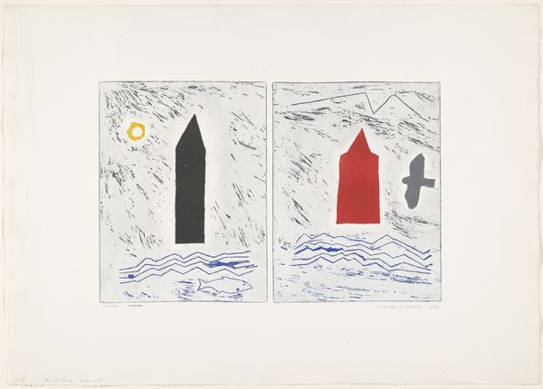 Curator: Josef Herman's piece, "On the Way Home," held here at the Tate, presents us with a starkly rendered scene. Editor: My first thought? A silent film still. The limited palette and blocky figures give it such a vintage, almost somber feel. Curator: Indeed. The figures themselves are archetypal, almost iconic. Consider the hooded rider – echoing centuries of symbolic portrayals of travelers and wanderers. Editor: And that crescent moon, repeated almost like a mirrored thought – is it a promise or a warning? I can't decide. Curator: Perhaps it's both. The journey home is rarely simple; it's laden with cultural expectations and psychological burdens. Editor: I like that—a visual representation of the complexities of homecoming. Even with these basic shapes, there's an emotional depth here. Curator: Precisely. Herman captures the weight of tradition and individual experience in deceptively simple forms. Editor: It’s definitely lingered with me. There's this quietude about the piece that's really compelling.