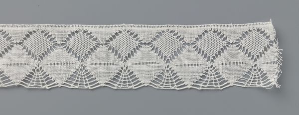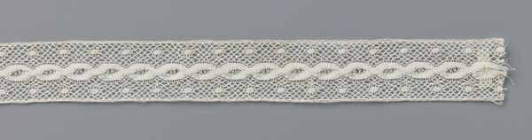 This handmade bobbin lace with a leafy border, by M. Schutten-Putters, feels like a study in rhythm and repetition, doesn't it? The way the artist has approached the making of this lace seems to be rooted in a deep understanding of process, each knot and stitch a deliberate mark. There's a beautiful, almost ghostly quality to the texture of this work. Look closely, and you can see the delicate interplay between the solid, woven areas and the airy, open spaces. The colour, or lack thereof, contributes to this ethereal feeling, the pale thread creating a surface that's both fragile and resilient. It's amazing how much depth and complexity can be achieved with just a single thread! I can't help but think of the meticulous detail in Hilma af Klint's botanical drawings, though I doubt she's a direct reference. This bobbin lace evokes a similar sense of wonder and reverence for the natural world. It’s this ongoing conversation across time that makes art so exciting!