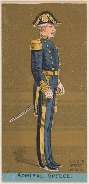 Curator: Well, isn't this a dapper fellow! We're looking at a print from 1888, titled "Lieutenant Commander, United States Navy, 1886," part of the Military Series created by the Kinney Tobacco Company. It was originally a promotional card for Sweet Caporal Cigarettes. Editor: It’s like a rigid doll; stiff and strangely devoid of life, considering it was meant to promote something supposedly pleasurable! I mean, look at the formality, the unyielding gaze. Is this selling cigarettes, or naval discipline? Curator: Perhaps back then the idea of discipline and strength appealed to consumers, linking smoking with a sort of masculine authority? Kinney Brothers were tapping into a societal ideal. Notice the exquisite details of the uniform, almost photographic, especially the gold epaulettes and hat tassels. Editor: And who gets to embody that ideal? Certainly not everyone. These images perpetuated a very specific and exclusive vision of power: white, male, and tied to institutions like the military, which historically, have been implicated in colonial and imperial projects. Curator: That's true, the image is incredibly selective. There is an almost satirical feel, particularly given its cartoon-like style. Editor: Exactly! That caricature-like quality almost undermines the supposed authority it's trying to project. Think about the context – mass consumerism taking root, the rise of advertising – it's like a twisted funhouse mirror reflecting the era’s aspirations and anxieties. Curator: But perhaps the stiffness also speaks to the limitations of printmaking technology at the time, creating a flattened, almost iconic representation. Even so, there's undeniable charm to its directness and clarity of color. Editor: Oh, I agree. It's fascinating as a historical artifact. It offers us a window into the cultural codes of the time, inviting us to deconstruct the relationships between power, representation, and commerce. And in the same motion reveals how so many cultural assumptions were embedded into society at large, some that we continue to battle against in present day. Curator: A tiny rectangle holding a rather immense history, isn't it? Something to consider.