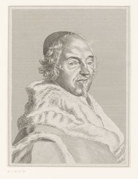 Editor: This is Claude Mellan's print, *François-Théodore de Nesmond,* created sometime between 1656 and 1666. It's quite striking. What stands out to me is how the varying lines seem to describe both the form and texture of his face and garments. What do you see in this piece? Curator: Formally, Mellan's manipulation of line is the most compelling aspect. Consider the interplay of light and shadow achieved solely through the density and direction of the engraved lines. Observe how he uses parallel lines to create areas of shade, then varies the pressure to suggest a round form and differentiate textures, for example, of the skin compared to fur. Do you notice any inconsistencies in this technique? Editor: Now that you mention it, in the lower left corner, the lines seem a little less confident, perhaps hurried compared to the meticulous rendering of the face. Curator: Indeed. That slight shift reminds us of the artist’s hand, a subtle break in the otherwise controlled, almost mathematical approach. This variance imbues the work with a sense of authenticity. The drawing’s expressiveness becomes heightened through these variations in the print. Editor: That’s fascinating! So, it’s the very technique, the materiality of the print itself, that carries so much of the artistic weight. Curator: Precisely. By focusing on the composition and technique, the material qualities of the print, we can extract layers of meaning and appreciation. Editor: I learned so much by concentrating on how the medium created its meaning. Thanks. Curator: A worthwhile exercise indeed. This focus helps reveal an otherwise veiled understanding of an artwork.