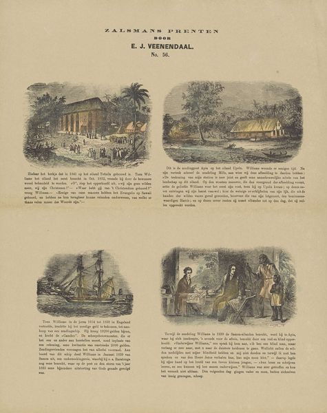 This lithograph, "John Williams op Samoa," was created by Gerhardus Philippus Zalsman at an unknown date, and presents a series of images depicting the life and work of the missionary John Williams in Samoa. Focusing on the visual narratives, the artwork provides insights into 19th-century European perceptions of missionary work and cultural encounters in the Pacific. It reflects the intersection of religious zeal, colonialism, and the representation of indigenous peoples. It’s interesting to consider how the illustrations capture both the efforts to convert and "civilize" the Samoan population, and the visual rhetoric used to portray cultural differences. It’s vital to consider how such images played a role in shaping European attitudes towards other cultures, and how they reflect the complex dynamics of power and representation inherent in the colonial project. "John Williams op Samoa" serves as a reminder of the intricate interplay between religious missions, cultural exchange, and colonial expansion.