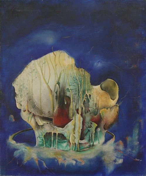 Editor: Enrico Donati's "St. Elmo's Fire," painted in 1944 using oil paint, is a truly strange and compelling piece. I'm struck by the… organic but also somewhat unsettling quality. What do you see in this work? Curator: I see a painting deeply embedded in its historical moment, grappling with themes of disruption and transformation. The Second World War was raging, and artists were wrestling with unprecedented violence and social upheaval. Consider the title - St. Elmo’s Fire - a weather phenomenon often associated with ships at sea. Do you see parallels between the uncertain, potentially destructive nature of that phenomenon and the anxieties of wartime? Editor: Yes, I think I do. The colours are dark and muddy, with these strange bursts of… well, fire, I suppose. It definitely feels turbulent. Curator: Donati's embrace of matter painting, the thick application of paint creating a tactile, almost sculptural surface, also speaks to a desire to break from tradition. How might this emphasis on materiality reflect a broader cultural rejection of established norms and beliefs in the wake of global conflict? Think about the rise of existentialism. Editor: So, the roughness of the paint, the sort of shapeless… form, everything is rejecting the past and searching for something new? Curator: Precisely! And note how the abstract form seems almost biomorphic, like a distorted, decaying organism. Is this simply a study in organic forms, or is it commenting on larger issues of death and rebirth after immense trauma? Does it suggest the world, both natural and social, is breaking down only to build itself again? Editor: That’s a lot to think about, but I can see that it is less abstract now, it's really saying something about its time and how Donati was thinking. Curator: Art acts as a cultural mirror reflecting the most complex social issues in specific visual codes. This helps us understand and reflect on our collective historical pathway.