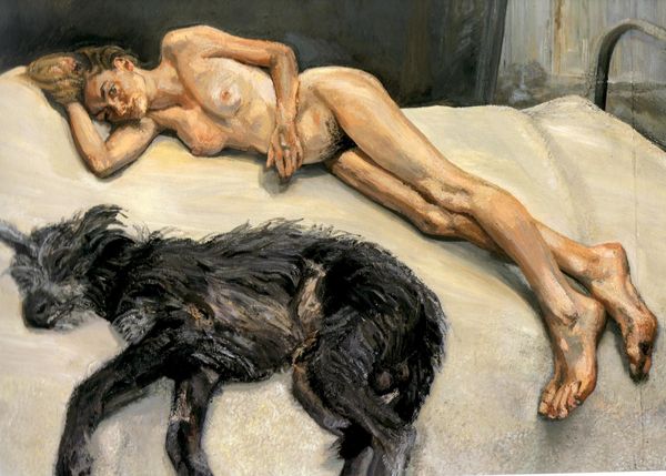 Editor: Here we have Max Liebermann’s “Samson and Delilah,” painted in 1902 using oil paint. I'm struck by the very deliberate brushstrokes; it feels incredibly raw and dynamic, almost unfinished. How do you interpret this work, looking at its formal elements? Curator: Note the contrast in textures, if you will. The background melts into an almost abstract field of blacks and browns, opposing the smooth, comparatively refined forms of the figures. The figures are undoubtedly the main structural element, so to speak, and they do seem positioned using simple, direct compositional lines and angles, with Delilah triumphant and dominant over Samson, presented rather ignominiously. Editor: The almost muddy colors definitely add to that sense of ignominy. It's hard to ignore that Delilah is presented very dynamically, hair aloft. She wields Samson's shorn hair—almost tauntingly, perhaps. Curator: Indeed. The palette emphasizes this dichotomy: Samson rendered in muted flesh tones versus Delilah presented more brightly, even with a degree of self-aware sensuality. One cannot escape noting the artist’s intent to lead the viewer's eye along specific axes. Editor: Those axes being from the background shadows onto the sheet, directing to Delilah, then cascading towards a subjugated Samson… Fascinating. Curator: Precisely. Each compositional component guides your emotional and visual understanding within a structured framework. It all feels meticulously—but discreetly—constructed, almost like semiotics. Editor: That’s definitely shifted my perspective, moving beyond the surface narrative to the visual structures beneath. Curator: As you perceive more intently and accurately, you observe better.