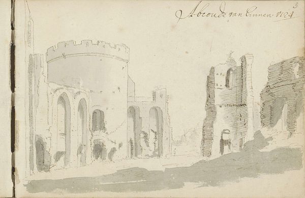 Editor: This drawing, "Ruïne van kasteel Abcoude," by Abraham Meyling, was created in 1724 using pen, ink, and pencil. There’s something quite melancholic about it, like a scene frozen in time, capturing the fragility of power. What do you see in this piece? Curator: I see a powerful commentary on the transience of structures, both physical and social. Ruins are never just about physical decay. Meyling is depicting a castle, traditionally a symbol of feudal power, now crumbling. What does this ruin signify in the context of 18th-century Netherlands? Were existing power structures also under threat? Editor: So, it’s less about the castle itself and more about what the ruin represents symbolically in its historical moment? Curator: Precisely. Think about the Dutch Republic's own struggles for independence and the changing landscape of European power at that time. How might the viewing public have interpreted this image of decay? Did it inspire reflection on their own society's impermanence, perhaps? Was there commentary in the decline? Editor: It’s fascinating to consider it as a commentary on broader societal shifts. It makes me wonder, did Meyling intend to critique the existing power structures, or was it merely an objective observation of decline? Curator: That’s the exciting part about art; the interpretation is never fixed. But by situating this image within its historical and political context, we can begin to unpack its potential meanings and understand its resonance for audiences then and now. Also, remember, who benefitted or suffered in these socio-political changes? Editor: I'm starting to see how essential it is to look beyond just the image and consider the sociopolitical landscape to fully appreciate the depth and complexity of a piece like this. Thank you! Curator: Exactly! And remember art is often as much a mirror to society, its injustices, struggles, as it is to some individual sense of beauty. Now what can we take from this piece to inspire dialogue in our contemporary moment?